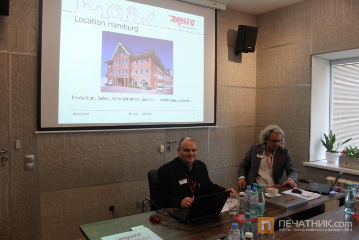 На презентации Andreas Kretshmer, представитель компании Aristo, рассказал о моделях плоттеров основных линеек TL, GL, LFS, отличающихся между собой размером рабочего поля, которое может достигать до 5-ти метров в ширину и 7-ми метров в длину. Стоит выделить 3-х главных особенностях оборудования: