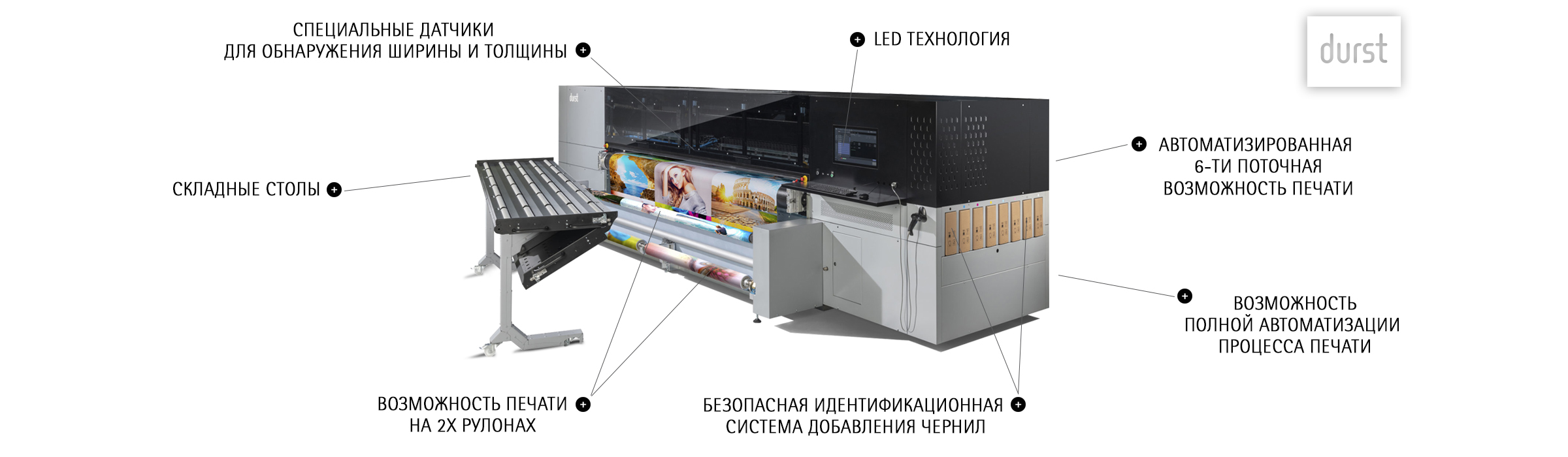 С 1936 года компания Durst, расположенная в Южном Тироле в Европе, проводит инновационную работу в области повышения качества и скорости воспроизводства изображений большого формата. Изначально компания работала в сфере аналоговой фотографии - производила фотоувеличители, а в последствии перешла на лазерное экспонирование изображений на фотобумагу. Это развитие заложило основу для создания первого широкоформатного струйного принтера для графического сектора. Durst также успешно нашел применение струйной технологии и в других промышленных областях и сферах применения.