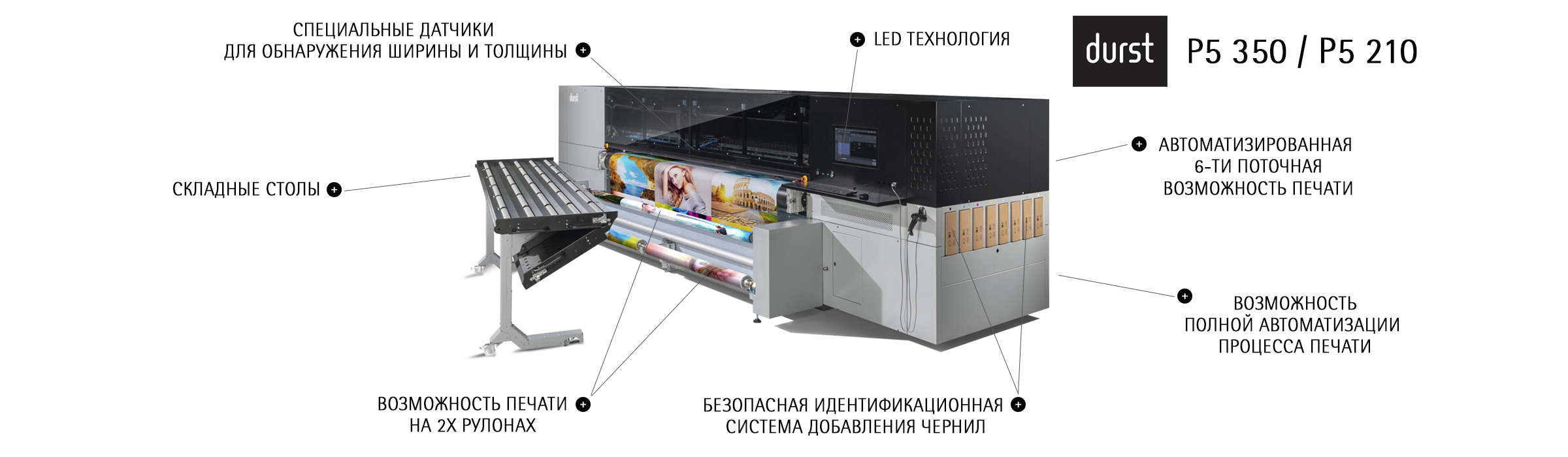 Гибрибные широкоформатные принтеры Durst P5 350 / P5 210 - это уникальное сочетание гибкости в задачах производста по возможности переключения между листовыми и рулонными печатными материалами и скоростью этого переключения. Полностью переработанный принцип смены типа носителя позволяет пользователю избежать потерь времени на планирование распределения задач и позволяет легко и быстро переключать материалы в соотвествии с запросами производства без потерь в производительности!