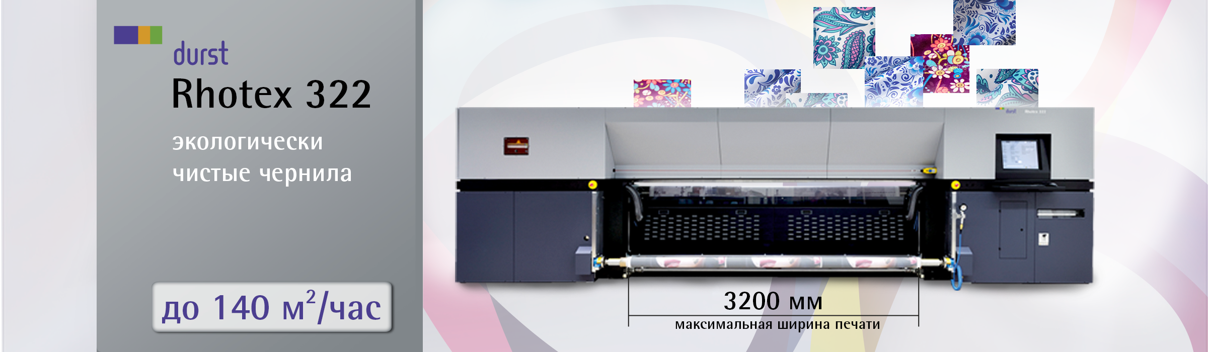 Доля цифровой печати на текстильных промо-материалах растет более чем на 50% в год. Rhotex 322 - это ответ Durst на запросы рынка. В отличие от других принтеров, которые печатают сольвентными чернилами или только небольшие заказы, Rhotex 322 спроектирован для промышленного использования. На скорости печати до 140 м²/час струйный принтер обеспечивает высокое качество печати с разрешением в 1200 dpi. Используемые вододисперсные чернила абсолютно экологичны и не имеют запаха, подлежат переработке, не производят летучих органических веществ, а также безопасны для кожи.