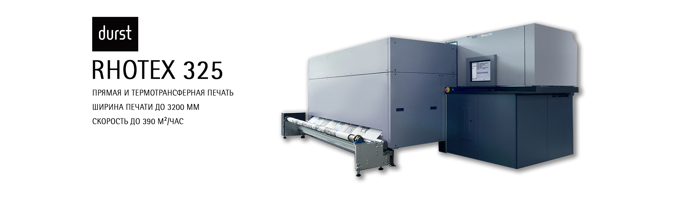 Компания Durst с гордостью представляет новую универсальную печатную систему Rhotex 325. Этот принтер был разработан как для прямой, так и термотрансферной печати по текстильным материалам шириной до 3,2 метров. В зависимости от области применения и свойств запечатываемой ткани, вы можете легко изменить режим печати с термотрансферной на прямую. Это стало возможным, благодаря новейшей технологии печатных голов Durst WTS. Благодаря этой технологии, стала возможна высококачественная печать воднодисперсными чернилами на различных материалах, а максимальная скорость печати достигает 350 м²/час. Весь печатный процесс полностью экологичен. При печати полностью отсутствует выброс в атмосферу вредных для здоровья летучих органических соединений. Более того, благодаря низкому расходу чернил, принтер Rhotex 325 отличается повышенной эффективностью. Надёжно сконструированный принтер Rhotex 325 оснащён устройством для сушки материала горячим воздухом, автоматической системой очистки дюз и другими опциями и предназначен для непрерывной работы в режиме 24/7.